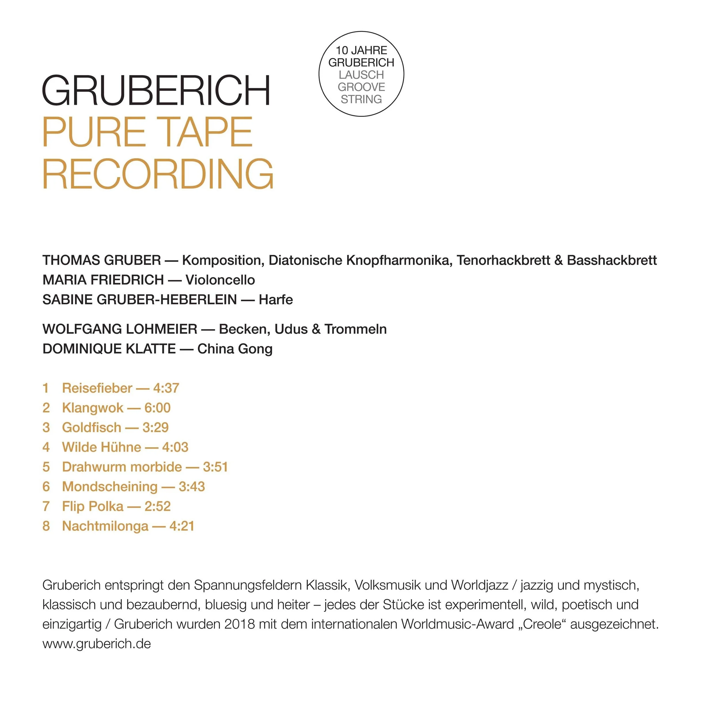 Maria Friedrich (cello), Sabine Gruber-Heberlein (harp), and Thomas Gruber (Styrian harmonica, hammered dulcimer) form the GRUBERICH trio. Their music is a promising mix, whose slogan “Lausch – Groove – String” aptly describes the experience that awaits the listener. “Lausch” means to listen attentively, “Groove” refers to rousing and driving rhythms in music, and “String” describes music played by string instruments. Thomas Gruber, quote from the homepage: “...the creative mind behind the trio” is responsible for the compositions and contributes sounds from Alpine musical culture with his tenor and bass dulcimer and Styrian harmonica. Maria Friedrich, quote: “...provides the necessary depth to GRUBERICH” adds classical accents. She plays her cello with a bow or plucks it, and sometimes also covers the bass range. Sabine Gruber-Heberlein, quote: “...provides the trio with heavenly sparkling sounds and crisp grooves,” uses her harp in a variety of ways. Altogether, this creates a melting pot that combines styles such as tango, polka, and milonga (“the cheerful sister of tango”) with classical elements and modern musical approaches. Any further description of this music would be an attempt, which is why I highly recommend listening to it. This album is also available on vinyl.